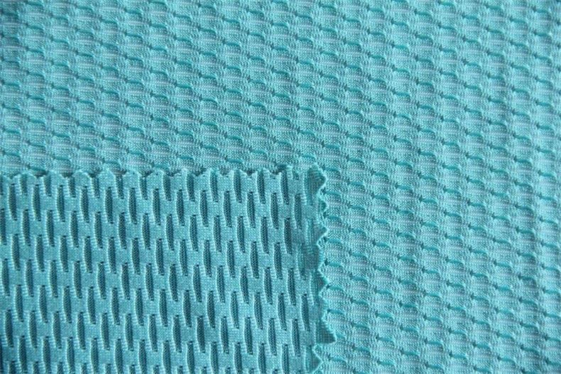Ein Polyester-Spandex-Jacquard mit Mesh-Optik und individuellem Muster, geeignet für Oberteile. Das Handgefühl ist trocken mit weniger Dehnung beim Herausziehen